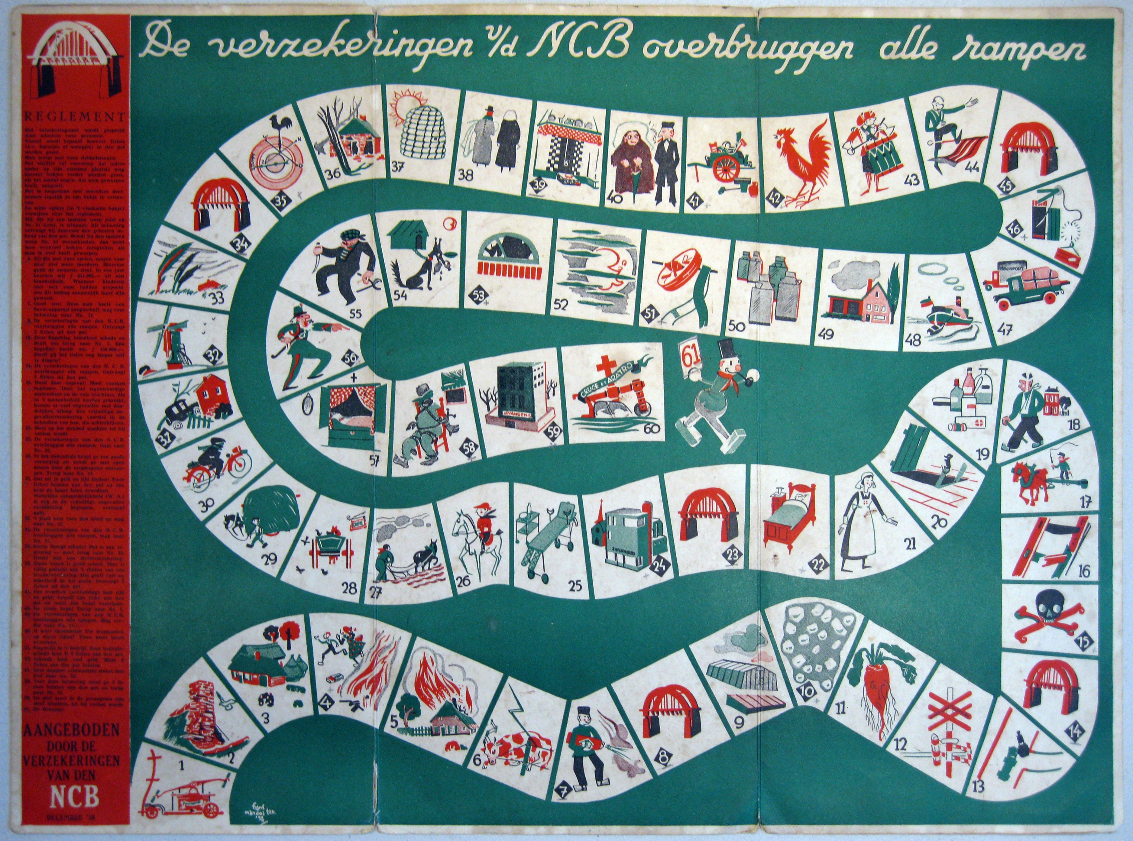 Op de winterse zondagavond speelden we wel eens het Verzekeringsspel van de NCB. Aan verzekerde leden werd het Brabantse familiespel in 1938 rond Sinterklaas verspreid. Het spel was gedrukt in Rood en Groen, “Rood en Groen is Boeren Fatsoen.”
