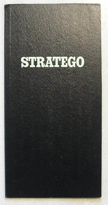 Speelbord met de speelzijde naar binnen gevouwen en de tekst STRATEGO op de ZWARTE rugzijde. Informatie over de speelstukken in de spelregels.