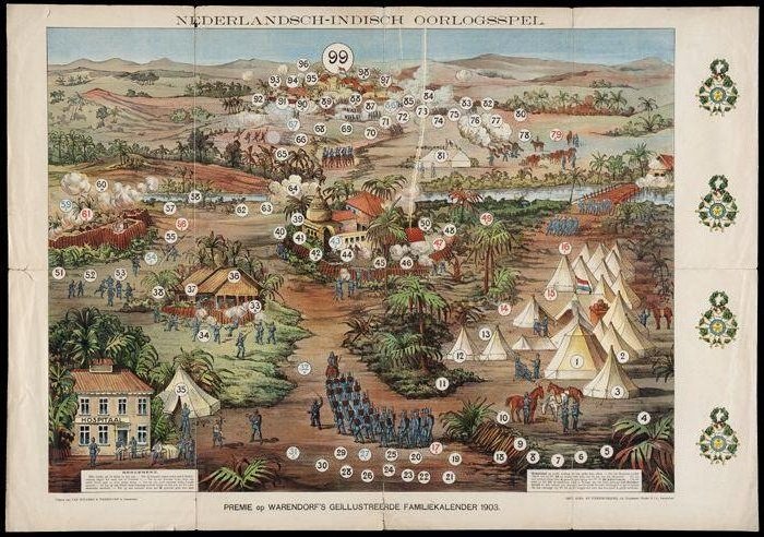 Bijlage bij Warendorf's Familiekalender 1903. De prent stelt mogelijk de Atjeh-oorlog (1873-1914) in Nederlandsch-Indiƫ voor. Dit was een koloniale oorlog die het Koninkrijk der Nederlanden voerde met als doel om de zeevaart door Straat Malakka te beveiligen tegen zeerovers uit Atjeh. Later was het doel het Sultanaat Atjeh onder Nederlands koloniaal gezag te brengen en te houden.