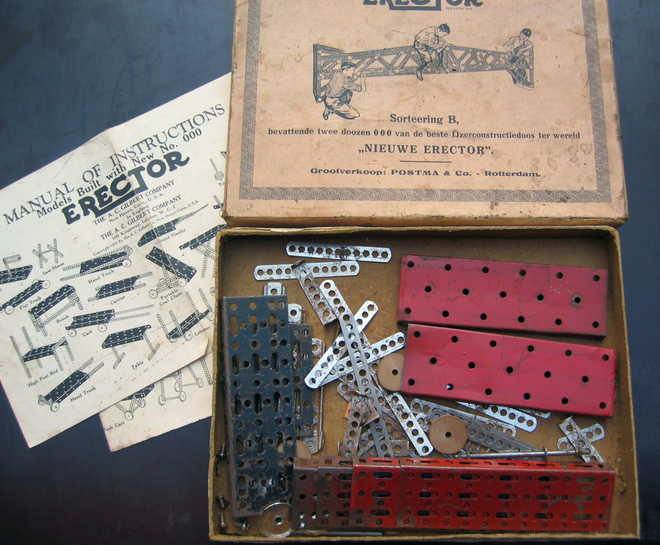 Erector bouwdozen werden ontwikkeld door de Amerikaan A.C. Gilbert in 1911 en vervolgens vanaf 1913 geproduceerd in de A. C. Gilbert Company aan de Erector Square fabriek in New Haven, Connecticut. Het afgebeelde import-exemplaar is door de firma Postma & Co te Rotterdam van een Nederlandse doos voorzien. Deze Erector dozen werden vanaf eind 1924 in Nederland verkocht in diverse maten, waaronder in ieder geval 000, 0, 1 en 3.
