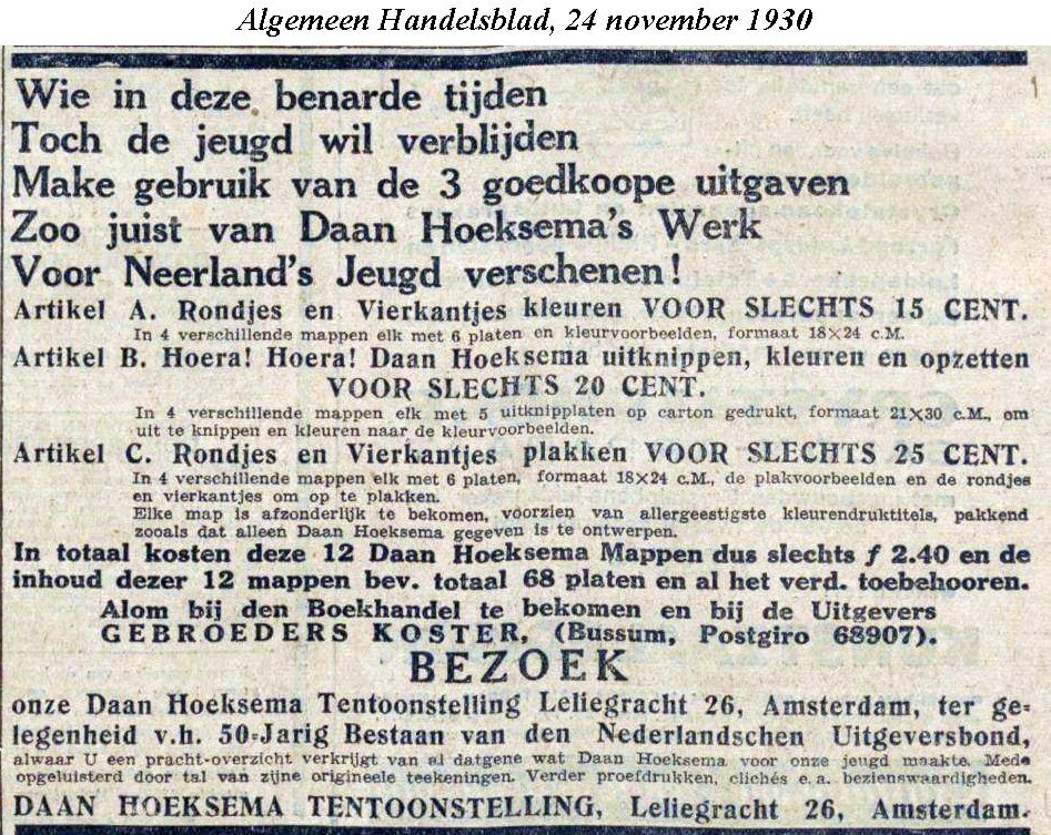 Wat Daan Hoeksema als kleuter knutselde. Naar gegevens uit zijn oude plakschriften. Foto 4 toont een advertentie uit 1930 waarin diverse Hoeksema mappen gebundeld werden aangeboden door Koster. De serie 'Wat Daan Hoeksema als kleuter knutselde' kwam echter al uit in 1927, getuige foto 4 bij 17683.