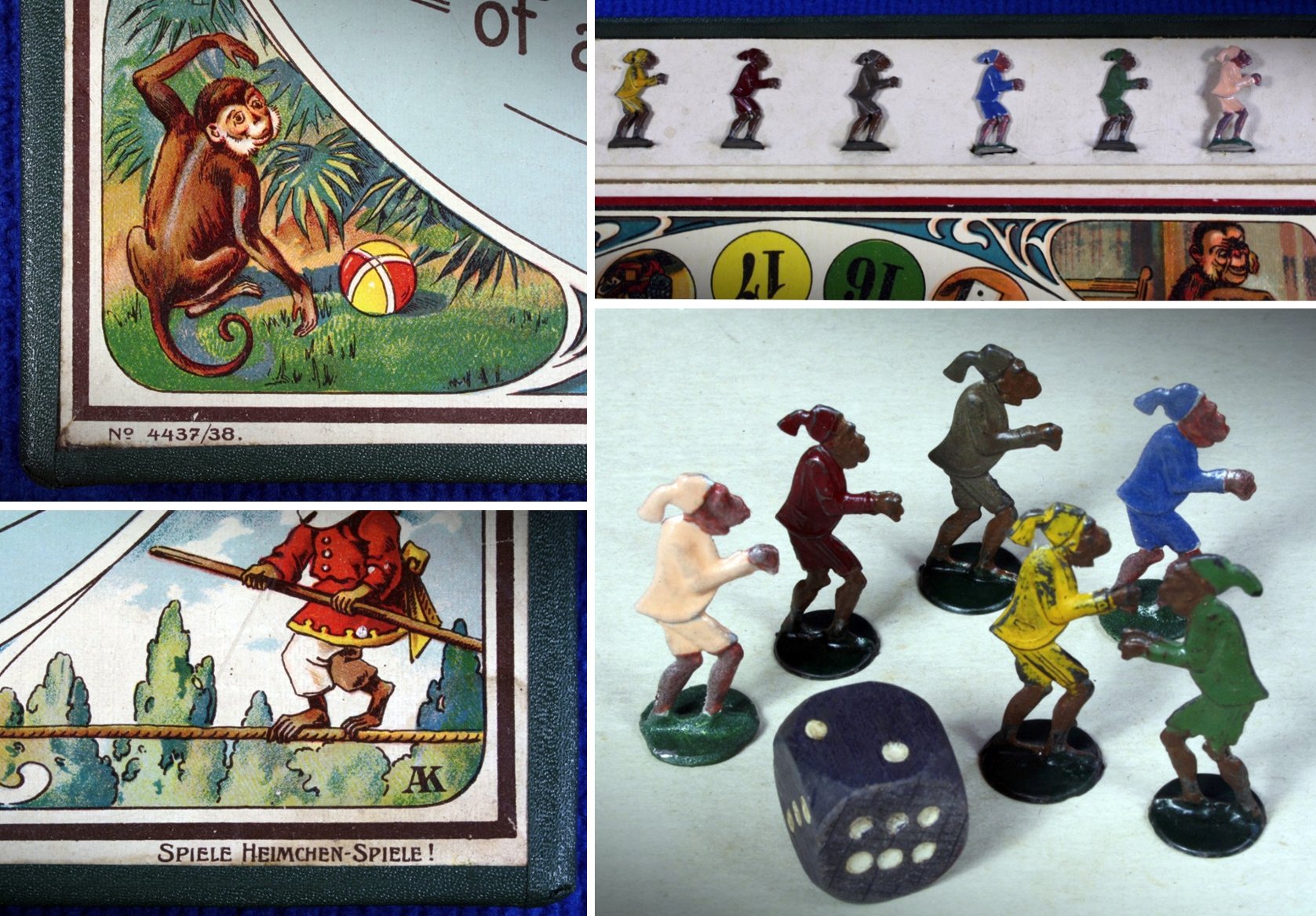 Inhoud: 2-delig speelbord, 6 tinnen apen-figuren, dobbelsteen, spelregels in de deksel. Foto 8 toont een speelbord op grijs bekleed karton. Afmeting speelbord 32,5 x 34 cm.Foto 1-7: Andreas Mutschke, Vintique-Toys