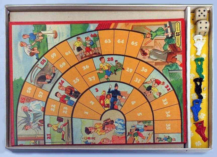 Bord in 2-en gevouwen. In het deksel en op het speelbord nog het oude logo met balkje.