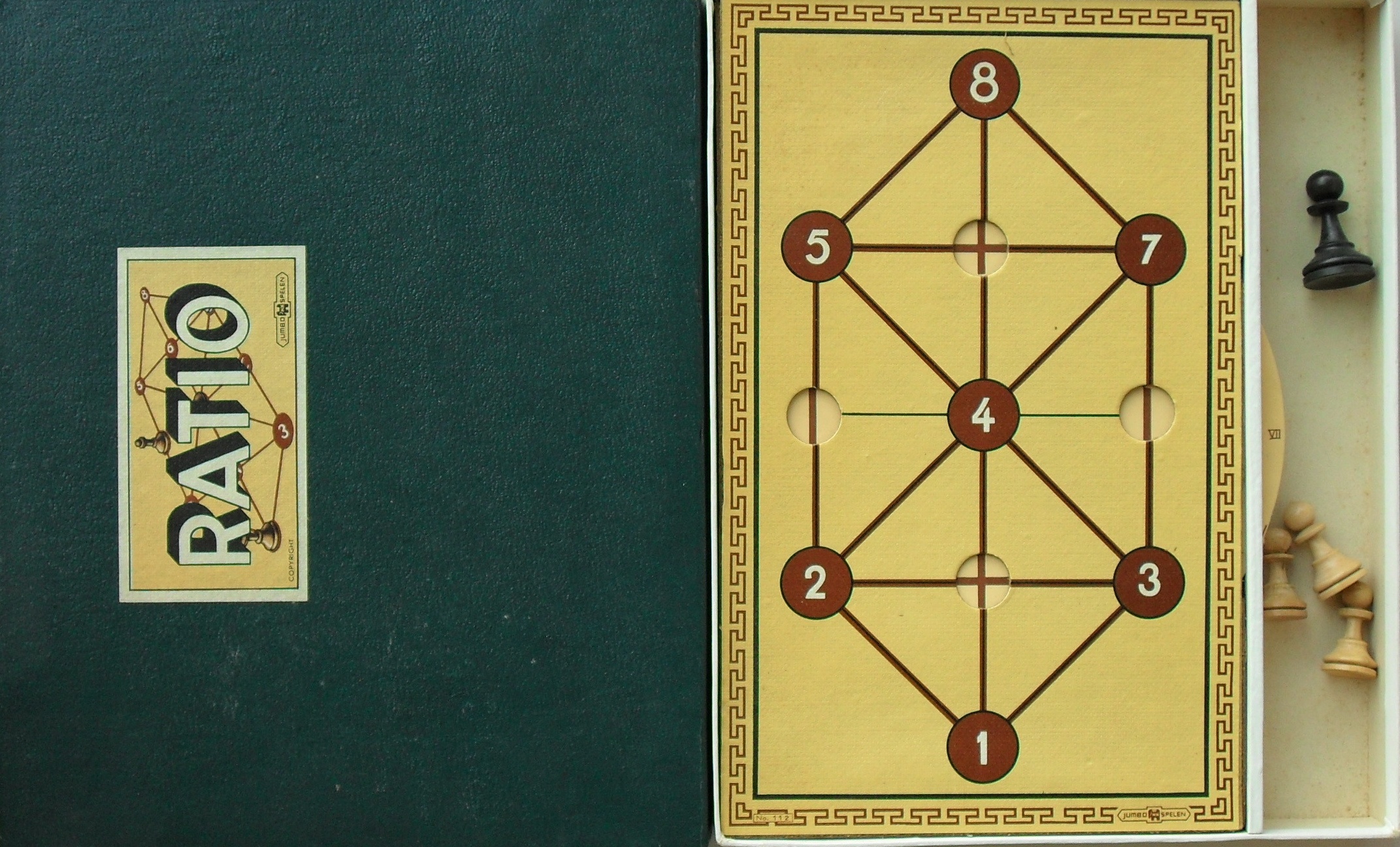 Geel Jumbo logo met zwart randje. Grootste uitvoering. Op foto 2 een afbeelding van het spel in een advertentie uit de Katholieke Illustratie van 25 januari 1958 (collectie Harm Bosman).